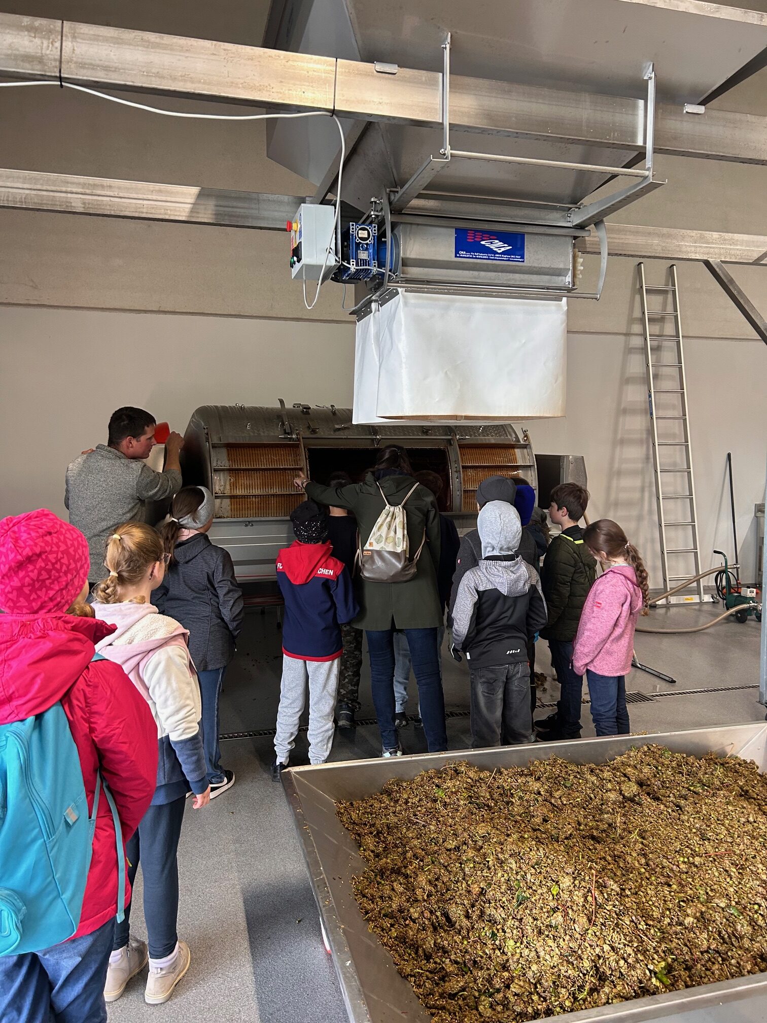 Wie die Reise für die Trauben weitergeht, konnten die Kinder dann in der Halle des Weinguts erfahren. Mit einem Stapler wurden die Trauben in die Presse geschüttet und alle durften des frisch gepressten Traubensaft unter der Presse mit einem Gläschen auffangen und probieren.